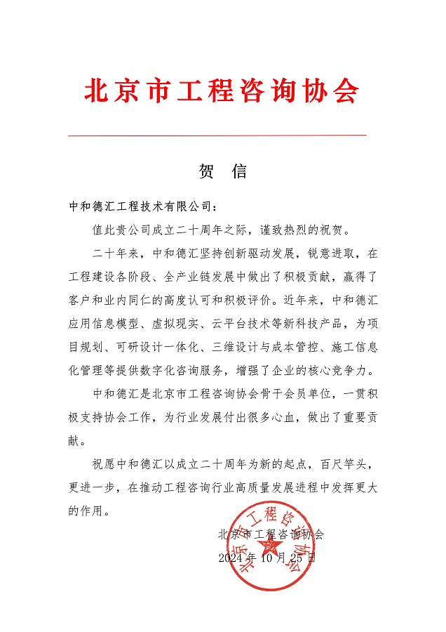 喜讯┃北京市工程咨询协会祝贺华体会手机登录入口20周年贺信